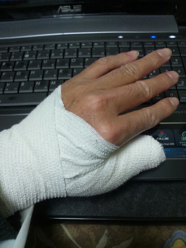 一夜明けてまだまだ痛いです(^^;。手首から靭帯移植せずに済んだので、包帯の量が予想より少なく残り四本の指が少し動かせるのが幸い。