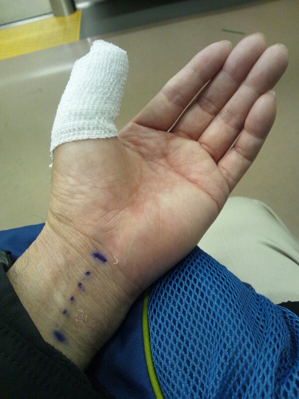 自分の左手親指も指表面を予定通り抜糸(7針だった)。