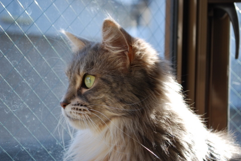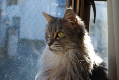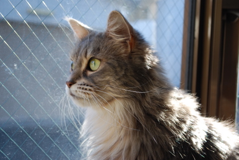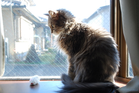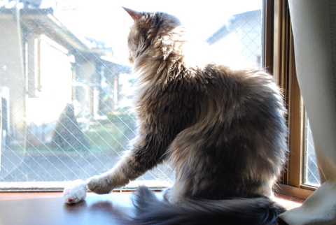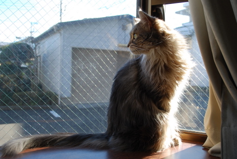 ジュディ、今朝からずっと出窓で外の監視中です(ひなたぼっことも言います(^^;)。