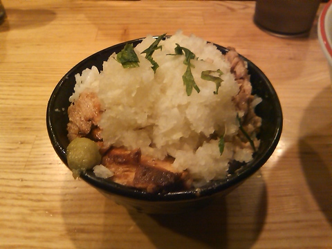今月のご飯は、小ぶりの茶碗に白飯、その上にチャーシューと大根おろしがたっぷり載ったおろしチャーシューご飯。チャーシューの下にわさびが少し入った、これもかなり満足の一杯でした。