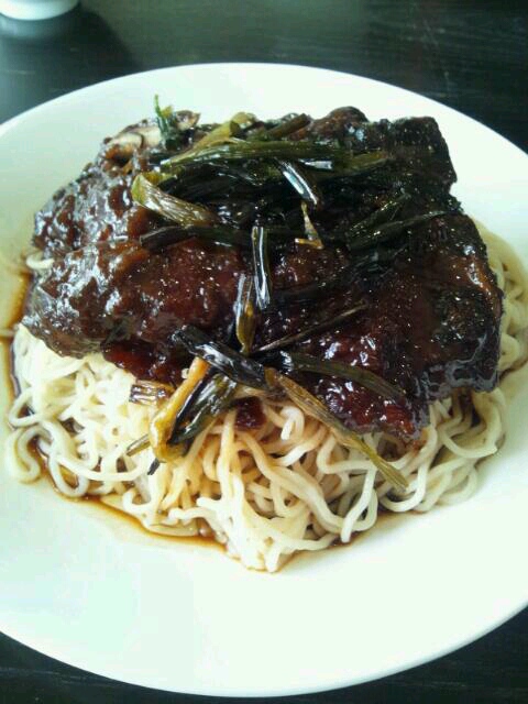 メインのパイコー葱油そばは、魚じゃないかと思わせるくらい軟らかく煮込まれた骨付き豚ロースが葱油であえた中華麺の上に乗っている品。
