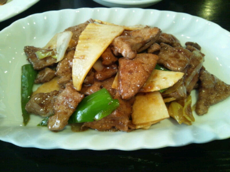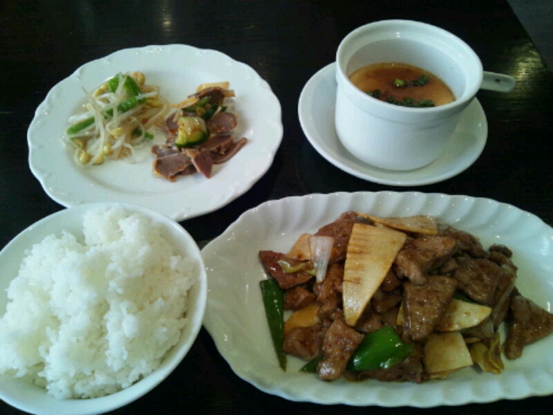 主菜は軽くあんかけしたレバースライスをネギ、筍、ピーマンと正油で炒めてあり、たっぷりのレバーが旨い。