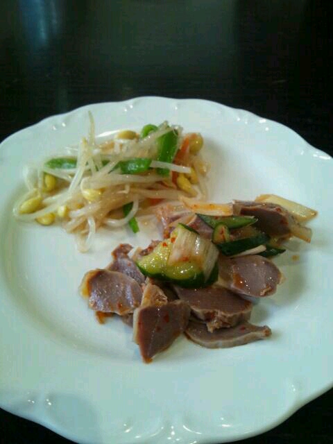 副菜が骨付き鶏ハムではなく、砂肝とキュウリの冷菜だった。適度な歯応えで旨い。