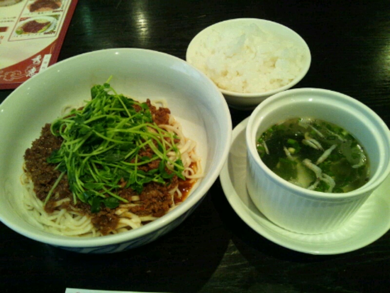 冷たい雨模様なのでフォーでも食べて温まろうと思いハノイへ行ったら休み…秀恵でジャージャー麺定食(750円)に変更。無料のライスも注文。