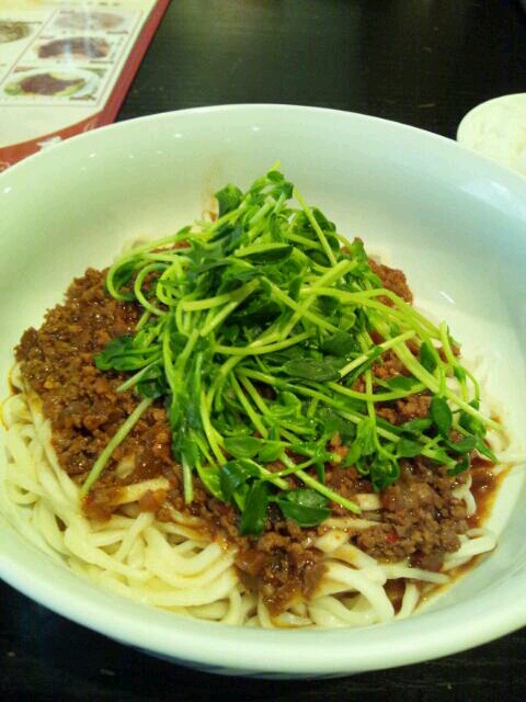 ジャージャー麺は豆苗たっぷり。甘辛(辛味の方が強い)で食べやすい。