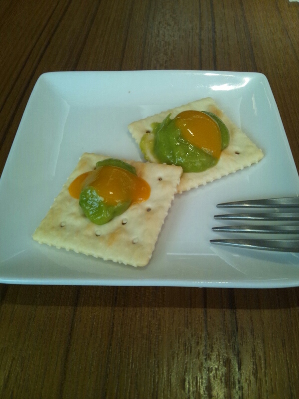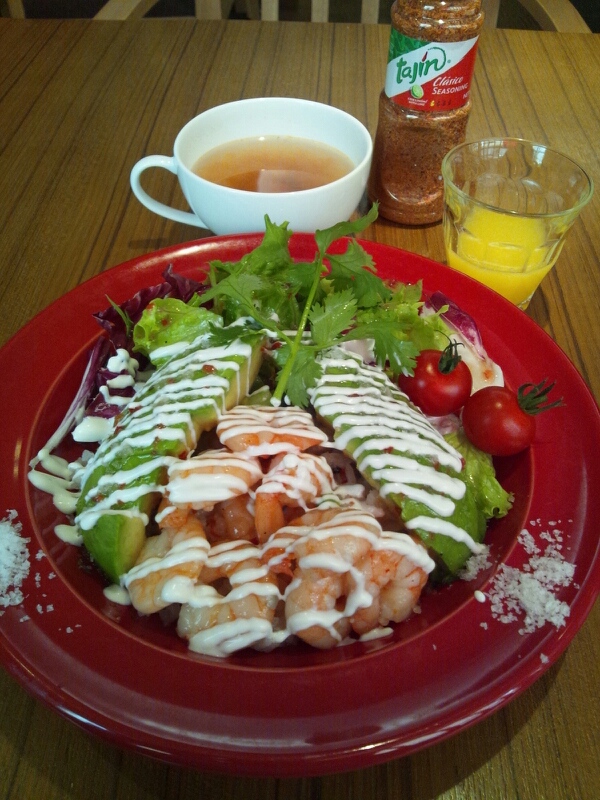 ガーリックの効いたボイルエビとたっぷりアボカドのせご飯。野菜にはパクチーも入ってる。セルフで飲み放題のミネストローネ、ミニジュース(今日はオレンジ、パプリカ、ハチミツmix)、デザート付(今日はマンゴーとアボカドをクラッカーに乗せたもの)。