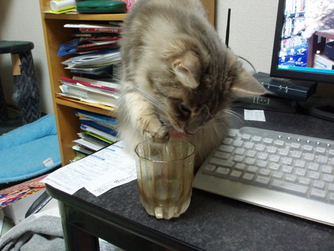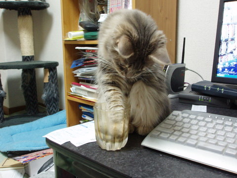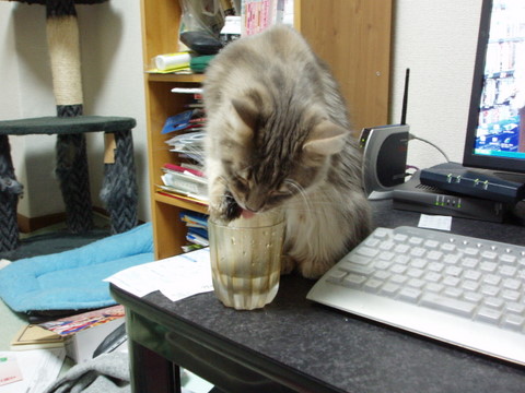 以前から、冷水器の水を飲もうとするとしきりに欲しがったので、以前から使っているウォーターファウンテンに少し入れてあげると喜んで飲んでいたのですが、まさか人のコップから飲むとは…。