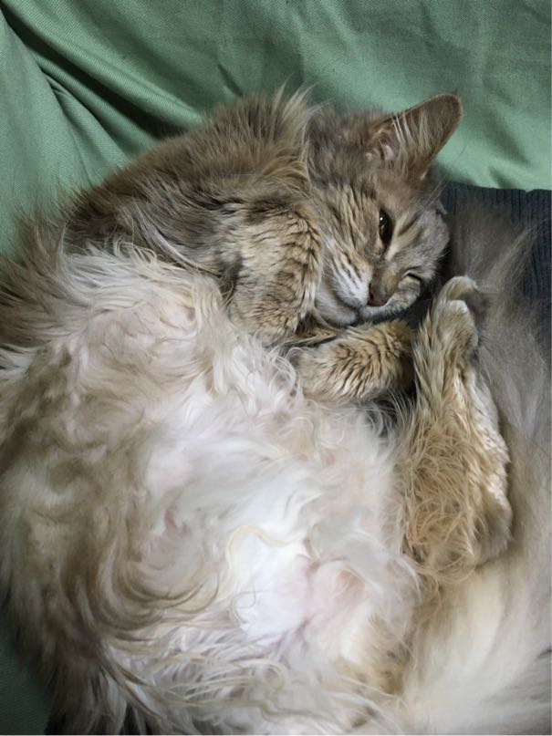 最近食欲が安定してきて、まれに嘔吐はあるものの概ね良好です。ただ、先週ちょっと気になることが...夜、風呂場にいたと思ったら突然ダイニングに猛ダッシュしてきて身体が小刻みに震えだし、キャットタワーに上ったり床に降りたりしてる時もブルブルと。4〜5分続いて収まったと思ったら、何事もなかったようにご飯を食べ始めました。その時の映像を少し撮れたので動物病院の先生に見せたのですが、なんの症状か特定できないとのこと。今後再発するか様子見です。