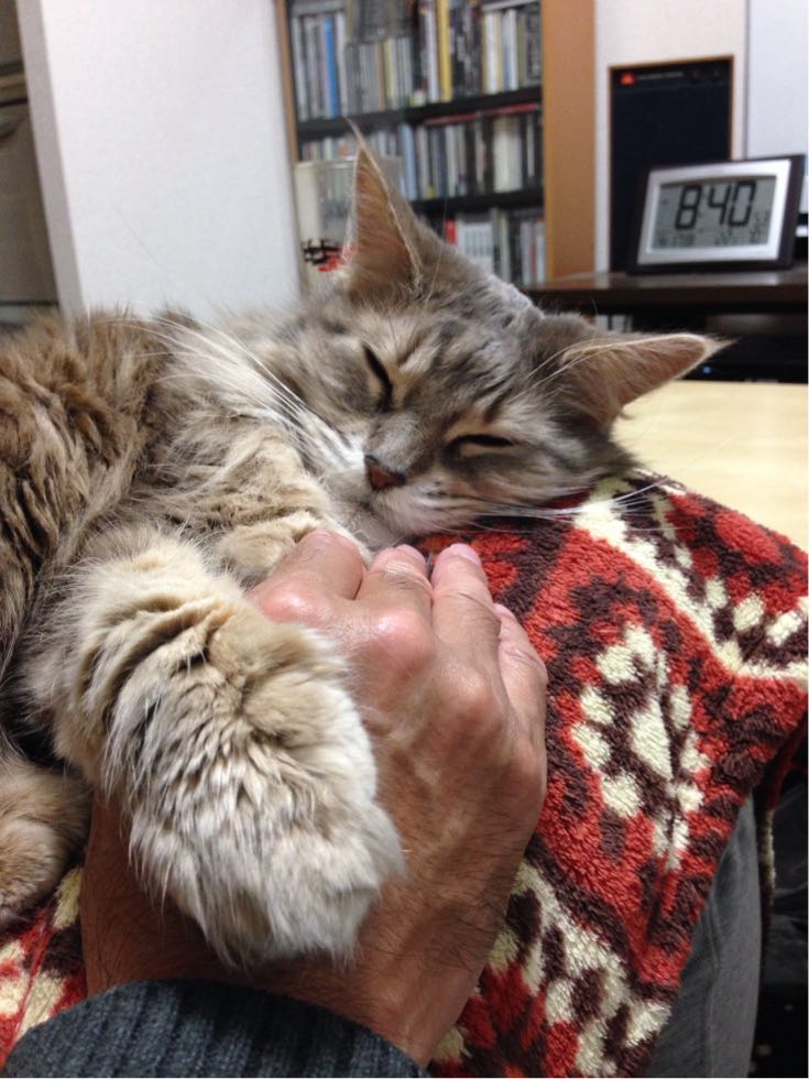 誕生日の朝はコタツの中から見送り。